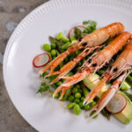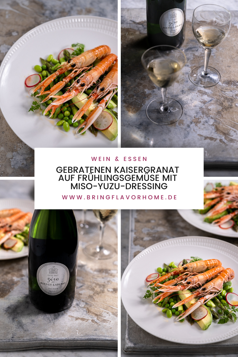 Gebratenen Kaisergranat auf Frühlingsgemüse mit Miso-Yuzu-Dressing