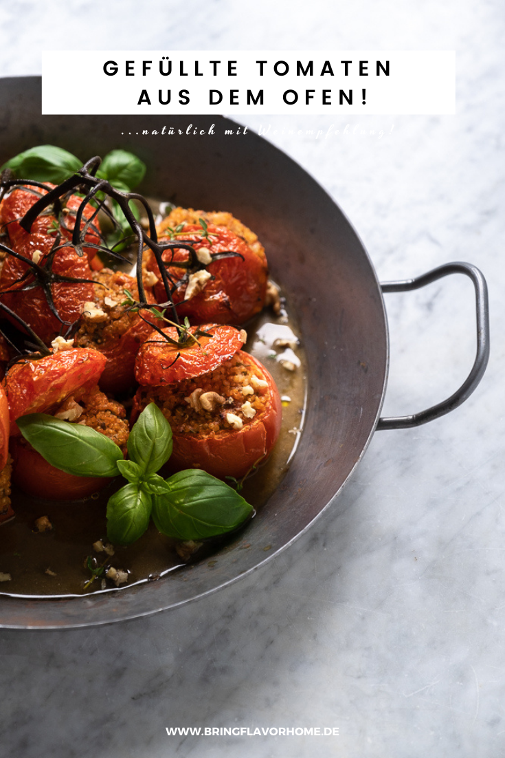 [drop_cap]Das Hervorragende an der Rebsortenvielfalt des Pay d´Oc IGP ist nicht nur, dass man den richtigen Wein für jeden Geschmack, sondern auch für jedes Gericht findet. Genau wie bei diesem Rezept. Und da zu tomatenbasierten Gerichten am besten leichte – mittelschwere Rotweine mit einer moderaten Säurestruktur passen, matchen wir zu den mit Quinoa gefüllten Tomaten einen sortenreinen Wein aus 100 % Pinot Noir Pays d’Oc IGP (aka Spätburgunder) von der Mittelmeerküste.[/drop_cap] Allein bei dem Wort „Mittelmeerküste“ bekomme ich Fernweh nach lauen Sommerabenden und „Mittelmeer-Soulfood“. Die gefüllten Tomaten durfte ich übrigens das erste Mal in Griechenland in einem Strandrestaurant probieren. Allerdings mit Reis und Gemüse gefüllt. Meine Interpretation der gefüllten Tomate kommt etwas würziger daher. Zu dem Quinoa gesellen sich nämlich noch Mozzarella, Halloumi, Kapern und ein ordentliches Portiönchen getrocknete Tomaten. Weggeschmissen wird auch nichts, denn das Kerngehäuse aus den ausgehölten Tomaten pürieren wir, sieben es ab und mischen es mit Gemüsebrühe – in diesem feinen Sud dürfen unsere gefüllten Tomaten dann für ca. 30 Minuten schmoren.