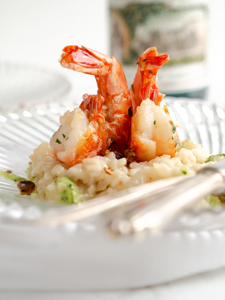 Nom, Nom, Nom! Raffiniertes Risotto mit Schwarzwurzel, Scampi und karamellisierten Haselnüssen. Für die Optik, habe ich das Ganze noch mit grüner Sauce aufgemotzt. Risotto ist so einfach in der Zubereitung und wirklich vielseitig einsetzbar. Du kannst den Reis wirklich mit allem pimpen, was du in die Finger bekommst. Schwarzwurzel ist nicht dein Ding? Dann greif zu Erbsen, Pilzen oder Spargel.