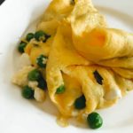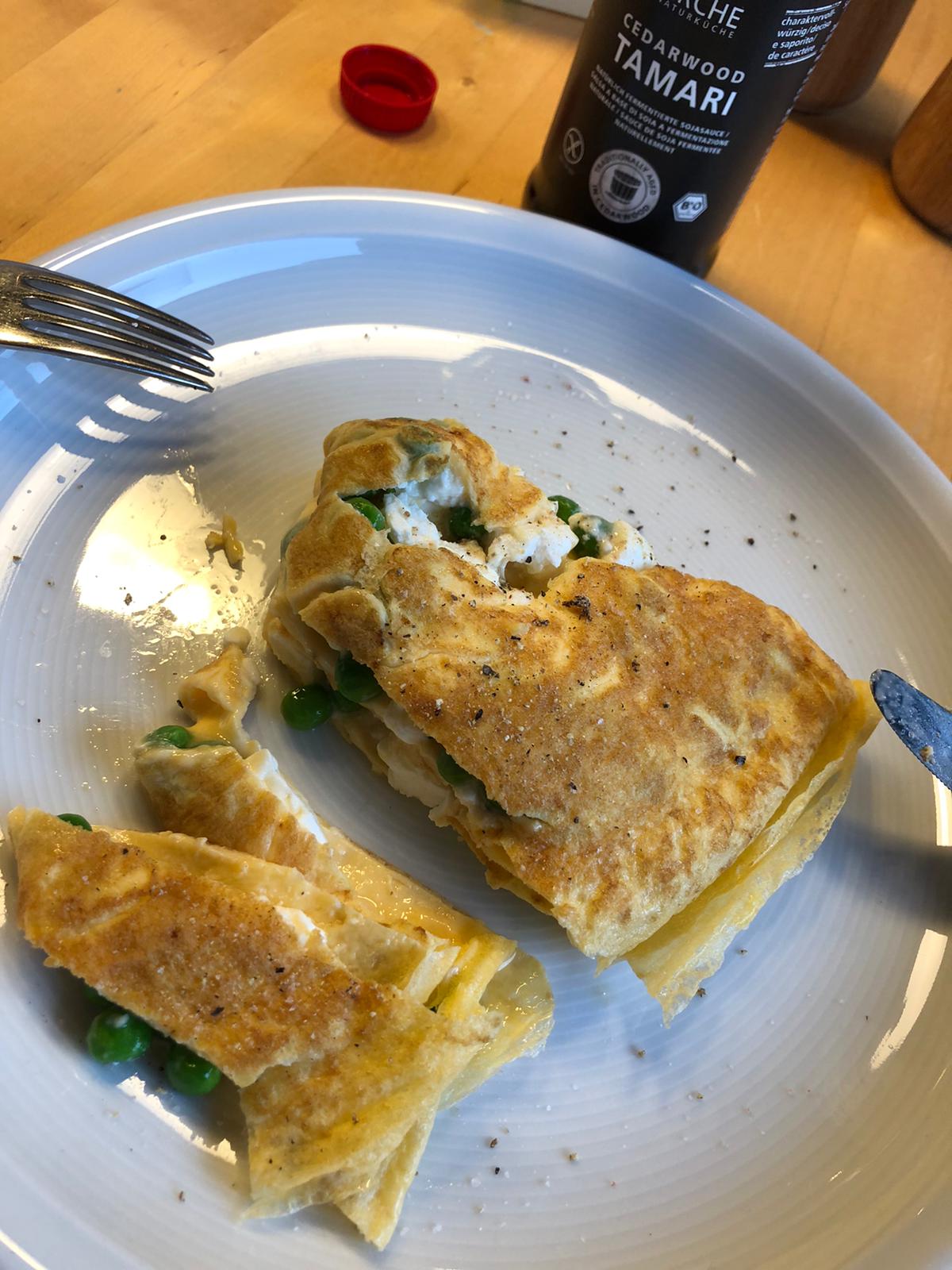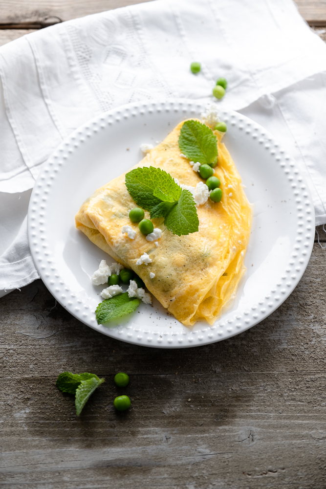 [drop_cap]Dieses Omelett ist der Knaller. Ob zum Frühstück, Brunch oder zur Brotzeit. Für dieses Traum – Omelett, weil so wunderbar fluffig, brauchst du keine 2 Minuten. Die Kombination aus frischer Minze, süßen Erbsen und cremigem Feta ist einfach unschlagbar. Normalerweise wird ein Omelett im Stil eines Pfannkuchens hergestellt – wir nehmen uns ein Beispiel an Crêpes. Wenn du die Eiermasse in die heiße Pfanne gibst, denkst du einfach die ganze Zeit an Crêpes – Crêpes, Crêpes, Crêpes.[/drop_cap] Das heißt wir arbeiten hauchdünn. Sobald die Eiermasse auf den Pfannenboden trifft, fängst du an sie in kreisenden Bewegungen gleichmäßig zu verteilen und ziehst dabei einen schönen hohen Rand. Dann wird unser Crêpe gleichmäßig belegt, an den Seiten mittels eines Gummispachtels gelöst und vorsichtig zusammengeklappt. Et Voila – da ist das Ding.