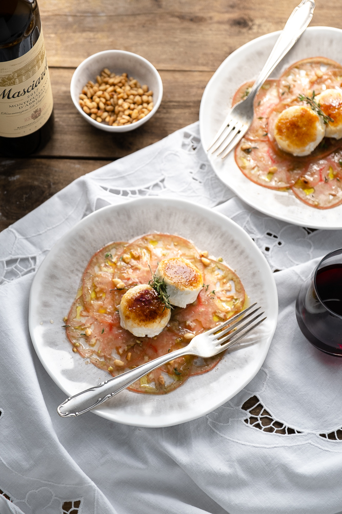 Tomaten-Carpaccio und karamellisierter Ziegenkäse
