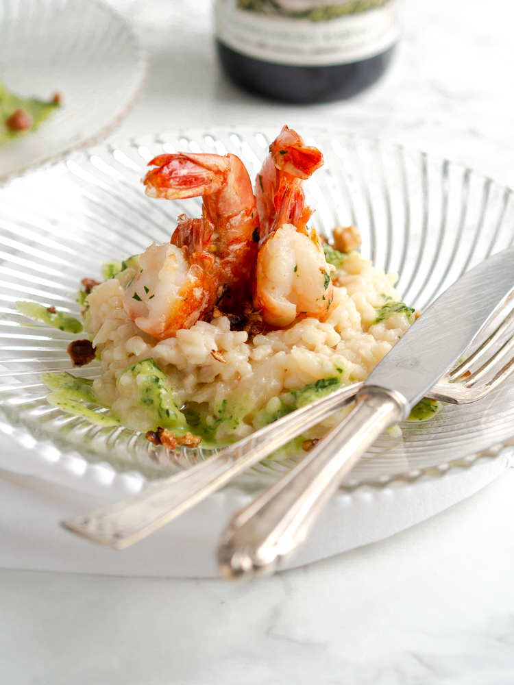 Nom, Nom, Nom! Raffiniertes Risotto mit Schwarzwurzel, Scampi und karamellisierten Haselnüssen. Für die Optik, habe ich das Ganze noch mit grüner Sauce aufgemotzt. Risotto ist